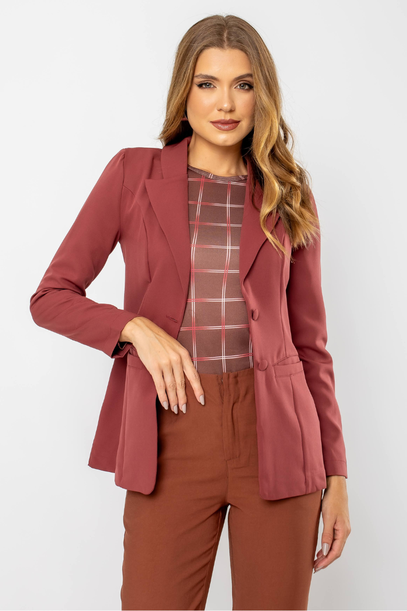 O blazer se destaca pelos detalhes impecáveis, que fazem toda a diferença no visual e no conforto. Sua modelagem valoriza a silhueta de maneira charmosa, criando um caimento perfeito. A gola confere um toque de formalidade, enquanto os botões são um charme à parte, adicionando um acabamento refinado. Os bolsos embutidos nos recortes são uma escolha estratégica e funcional. A ombreira proporciona estrutura aos ombros, enquanto os recortes nas costas asseguram um ajuste moderno. A fenda acrescenta movimento, tornando o blazer ainda mais confortável para o uso diário.