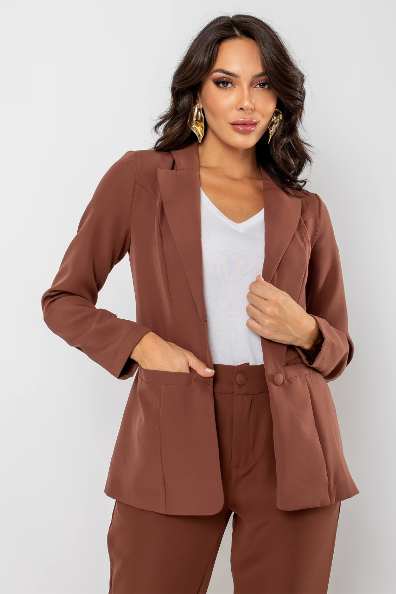 O blazer se destaca pelos detalhes impecáveis, que fazem toda a diferença no visual e no conforto. Sua modelagem valoriza a silhueta de maneira charmosa, criando um caimento perfeito. A gola confere um toque de formalidade, enquanto os botões são um charme à parte, adicionando um acabamento refinado. Os bolsos embutidos nos recortes são uma escolha estratégica e funcional. A ombreira proporciona estrutura aos ombros, enquanto os recortes nas costas asseguram um ajuste moderno. A fenda acrescenta movimento, tornando o blazer ainda mais confortável para o uso diário.