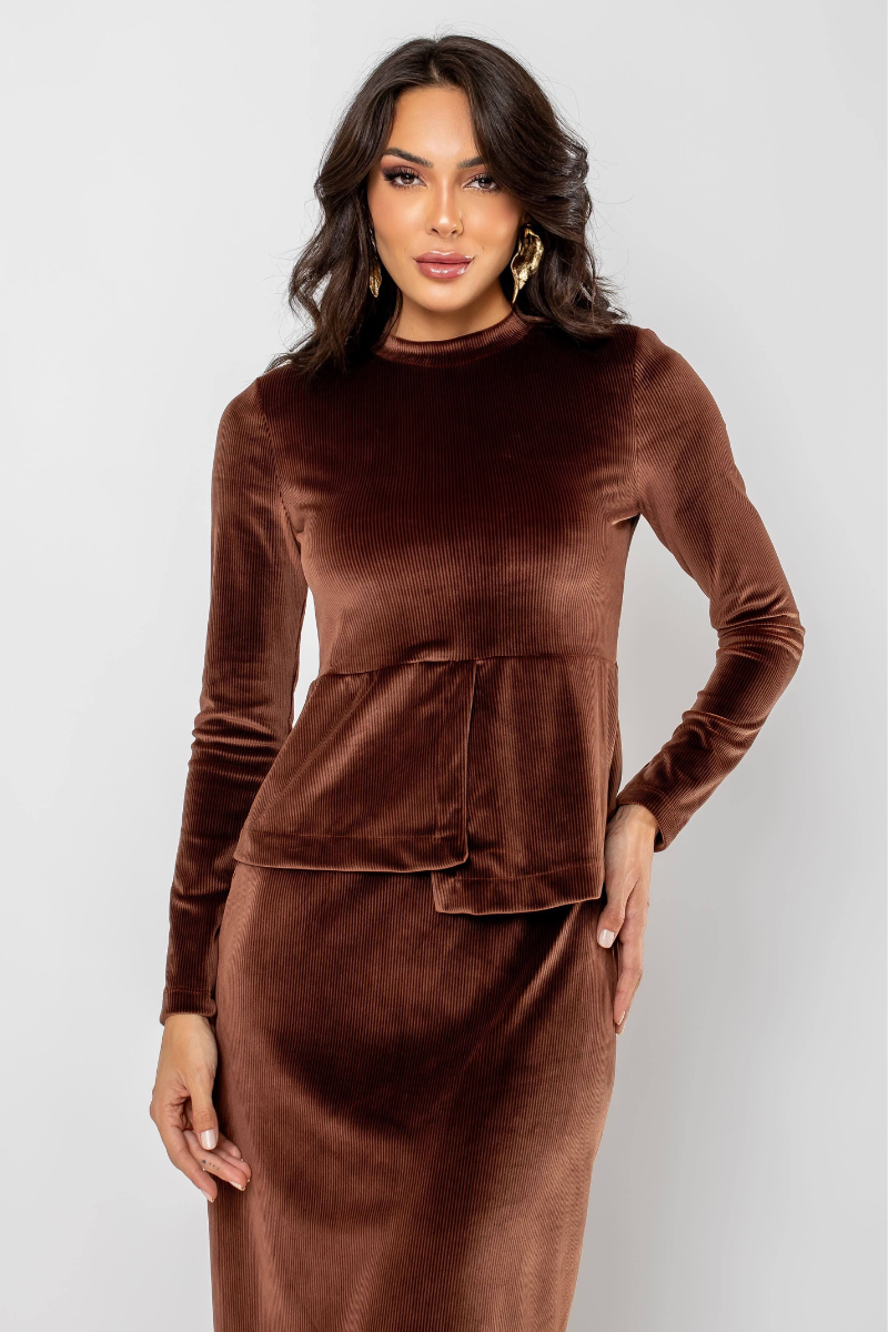 A blusa é confeccionada em veludo, composto por 93% poliéster e 7% elastano. Esse tecido oferece um toque macio e suave, com um leve brilho que confere charme à peça. A composição em poliéster garante durabilidade e resistência, enquanto o elastano proporciona maior elasticidade e conforto, assegurando um ajuste perfeito ao corpo.