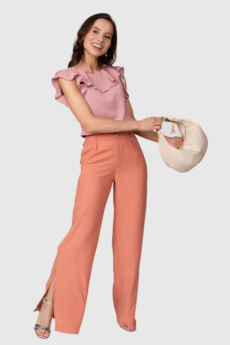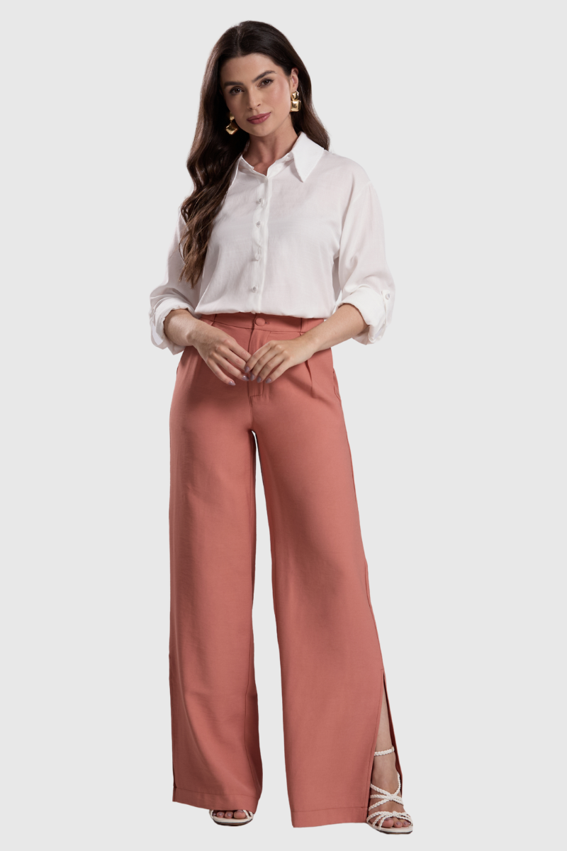 Esta calça une conforto e estilo com uma modelagem reta impecável. O design é contemporâneo e estruturado, apresentando cós clochard alto com passantes e cinto com fivela para um ajuste marcante na cintura. A peça conta com pregas largas pespontadas na parte frontal, que adicionam estrutura e caimento. Nas costas, pences garantem o ajuste perfeito à silhueta.
