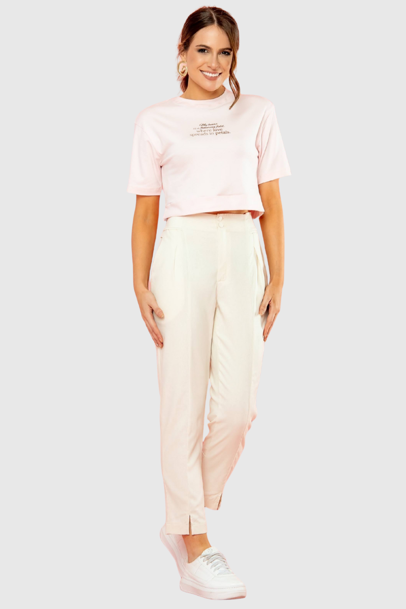 A calça é confeccionada em Linho Premium, um tecido que une 70% viscose, 28% linho e 2% elastano. Essa composição assegura um caimento leve e fluído, com toque macio e excelente respirabilidade, graças à alta concentração de viscose. A adição do linho confere a textura nobre e sofisticada da fibra, enquanto o elastano proporciona a mobilidade e o ajuste confortável, fazendo desta peça uma escolha de praticidade.