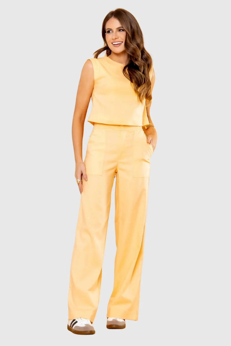 Esta calça une conforto e estilo com uma modelagem wide leg de caimento impecável. O design é contemporâneo e foca na praticidade e estrutura, apresentando cós elástico para ajuste confortável e botões forrados como detalhe frontal. A cintura possui leves franzidos e bolsos sobrepostos na frente, reforçando o estilo utilitário. Nas costas, há uma pala que modela o quadril e bolsos sobrepostos com formato arredondado. O acabamento é realçado por pespontos que enfatizam a construção da peça.