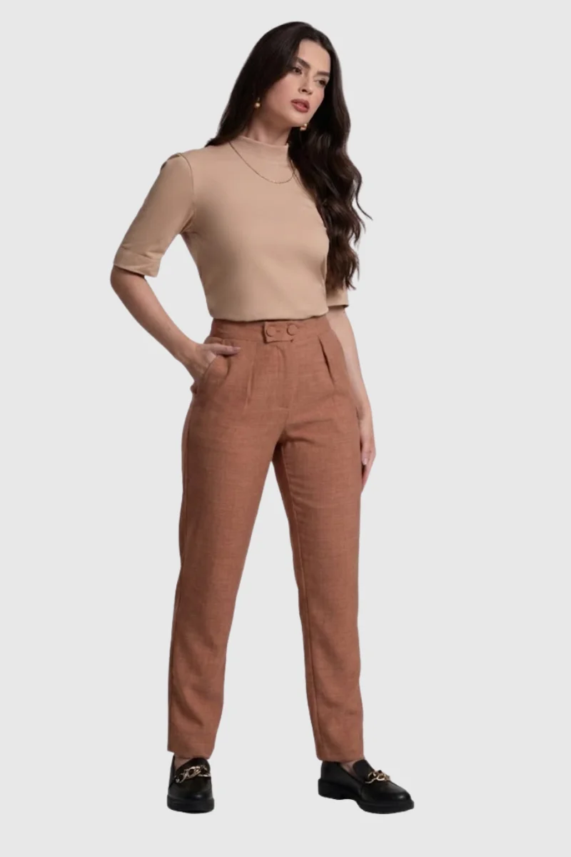 A calça é confeccionada em tecido com aspecto de Linho Rústico, composto por 100% poliéster. Enquanto o visual simula a trama elegante do linho natural, a composição garante uma peça muito mais resistente ao amassado e de fácil manutenção. Essa textura rústica adiciona um toque de alfaiataria clássica ao material, resultando em um item que une estética orgânica à praticidade e durabilidade do poliéster.