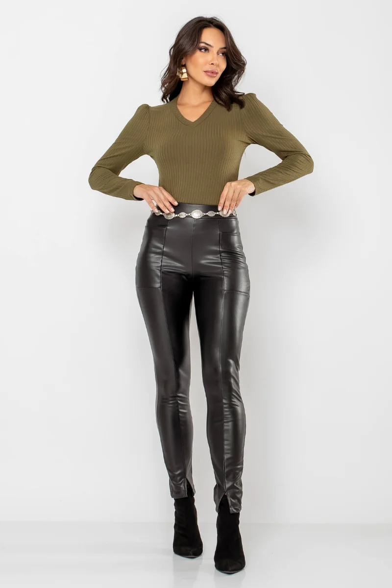 A calça é confeccionada em couro forrado, com a base composta por 95% poliéster e 5% elastano, e a face em 100% poliuretano. O couro forrado oferece resistência e conforto, enquanto o poliéster e elastano garantem flexibilidade e um bom ajuste ao corpo. O poliuretano na face proporciona a aparência do couro natural, tornando o modelo funcional e durável.