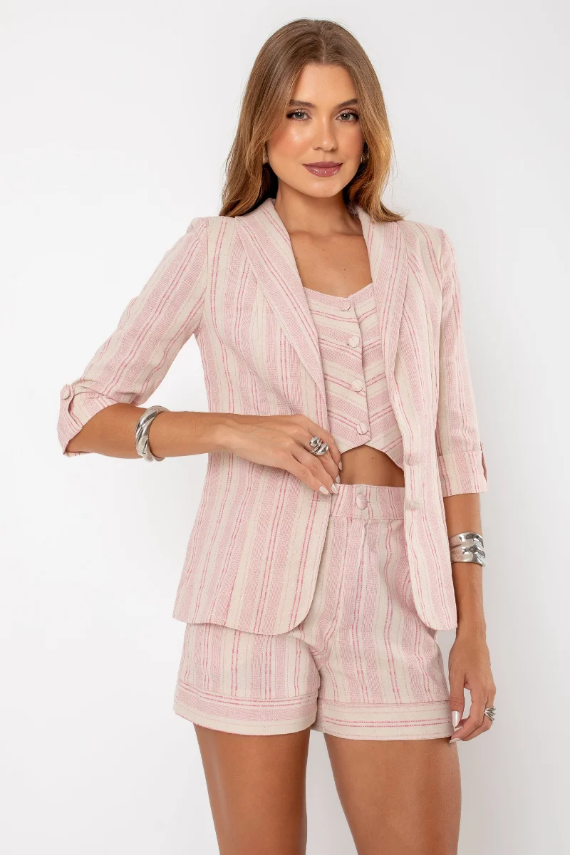 O conjunto se destaca pelos detalhes, como o blazer com uma gola charmosa, recortes e pences que modelam a silhueta, lapelas decorativas e martingale com botão, que permite dobrar a manga. A bermuda conta com pregas e bolsos faca, além de pences nas costas, garantindo um caimento perfeito e um visual alinhado.