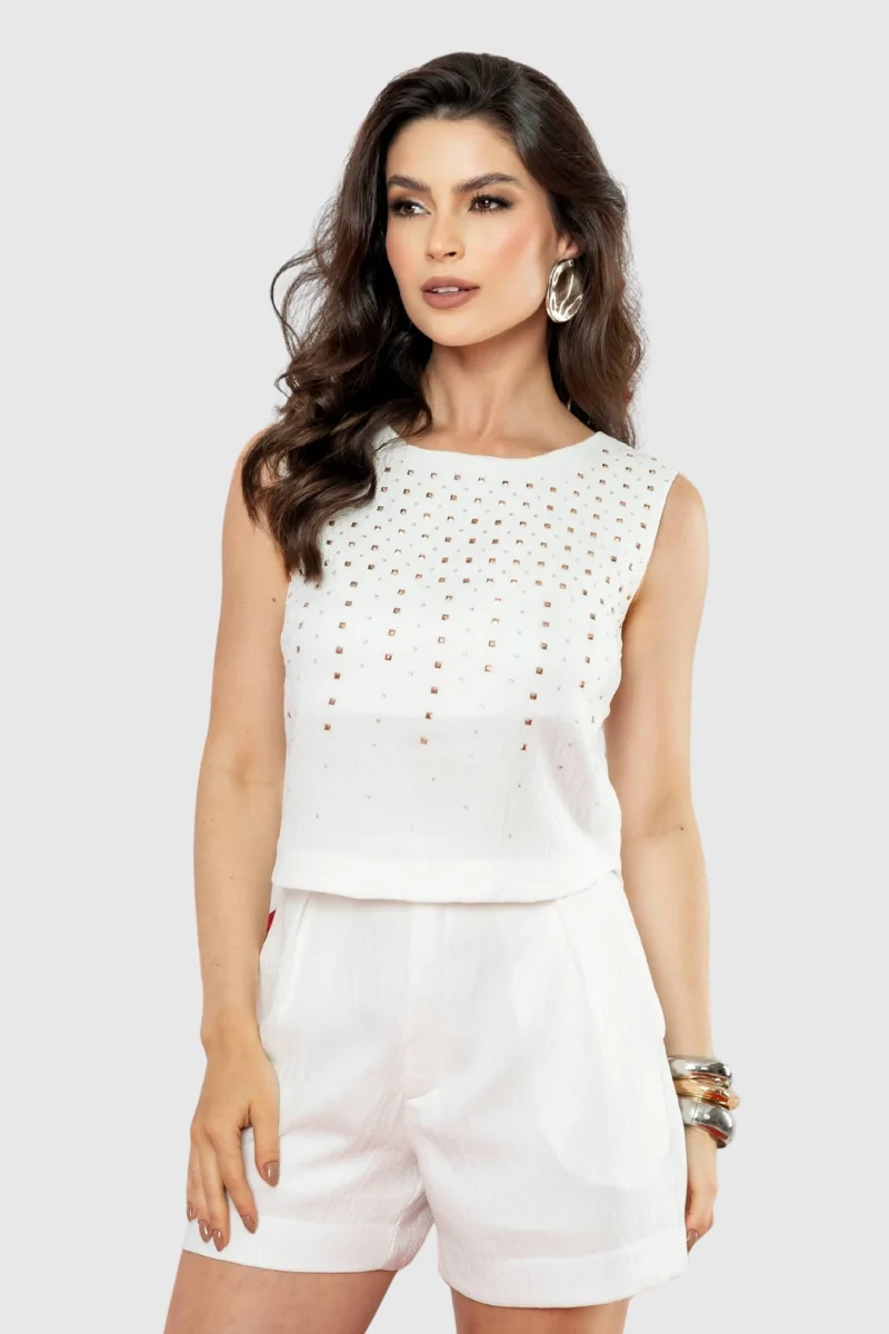 Desenvolvido com uma modelagem impecável, este conjunto oferece um caimento que garante conforto e um visual encantador. O charme reside nos detalhes que elevam o design: a Blusa apresenta decote arredondado, pences no busto (para melhor estrutura e ajuste da forma) e aplicação de strass (adicionando brilho e charme), finalizando com a barra curvada. A Bermuda possui fechamento por botão, pregas e bolsos faca; na parte traseira, conta com pences (garantindo um ajuste modelado e preciso ao corpo).