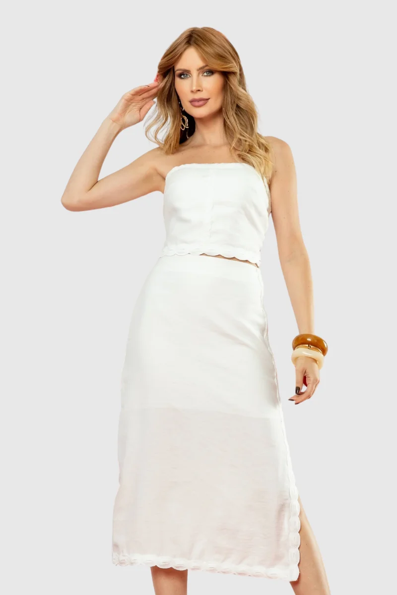 Desenvolvido com uma modelagem impecável, este conjunto oferece um caimento que garante conforto e um visual encantador. O charme reside nos detalhes que elevam o design: o top tomara que caia é estruturado com pences e gregas, e nas costas, conta com lastex e zíper para um ajuste perfeito. A saia midi possui uma fenda na lateral e detalhes em gregas; a parte traseira apresenta pences, zíper, e um recorte central (que ajusta o caimento ao corpo).