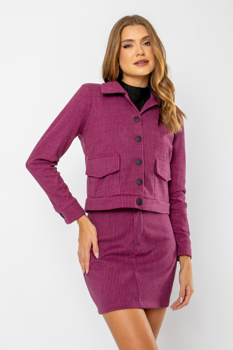 O conjunto se destaca pelos seus detalhes encantadores, como a jaqueta com gola, que adiciona um toque de estilo, o fechamento por botões, que confere um visual clássico, e os bolsos com lapelas, que trazem um charme extra à peça. As mangas com punhos e pequenas aberturas com botões acrescentam um detalhe delicado e interessante. Já a saia, complementada com um cinto com fivela, oferece um toque moderno e estruturado, criando um visual coeso e cheio de personalidade. Juntos, esses elementos fazem do conjunto uma opção versátil e cheia de estilo para diversas ocasiões.