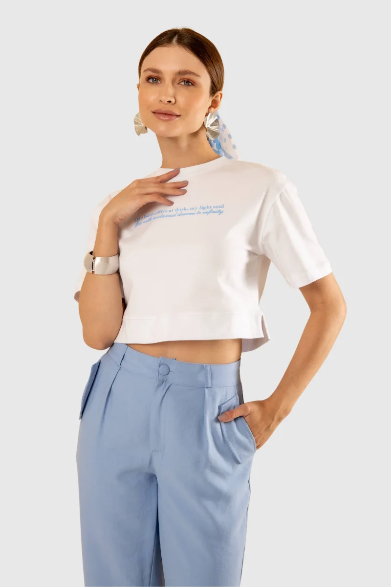 Este cropped se destaca por seus detalhes únicos, que garantem estilo e um ajuste perfeito. A modelagem curta valoriza a silhueta, enquanto a gola pespontada e a barra em punho com abertura lateral proporcionam um caimento estruturado e confortável. A cava deslocada adiciona um toque arrojado ao design, e a serigrafia delicada com a frase "Como borboletas ao anoitecer, minha alma leve voa com sonhos noturnos até o infinito" torna a peça ainda mais exclusiva.
