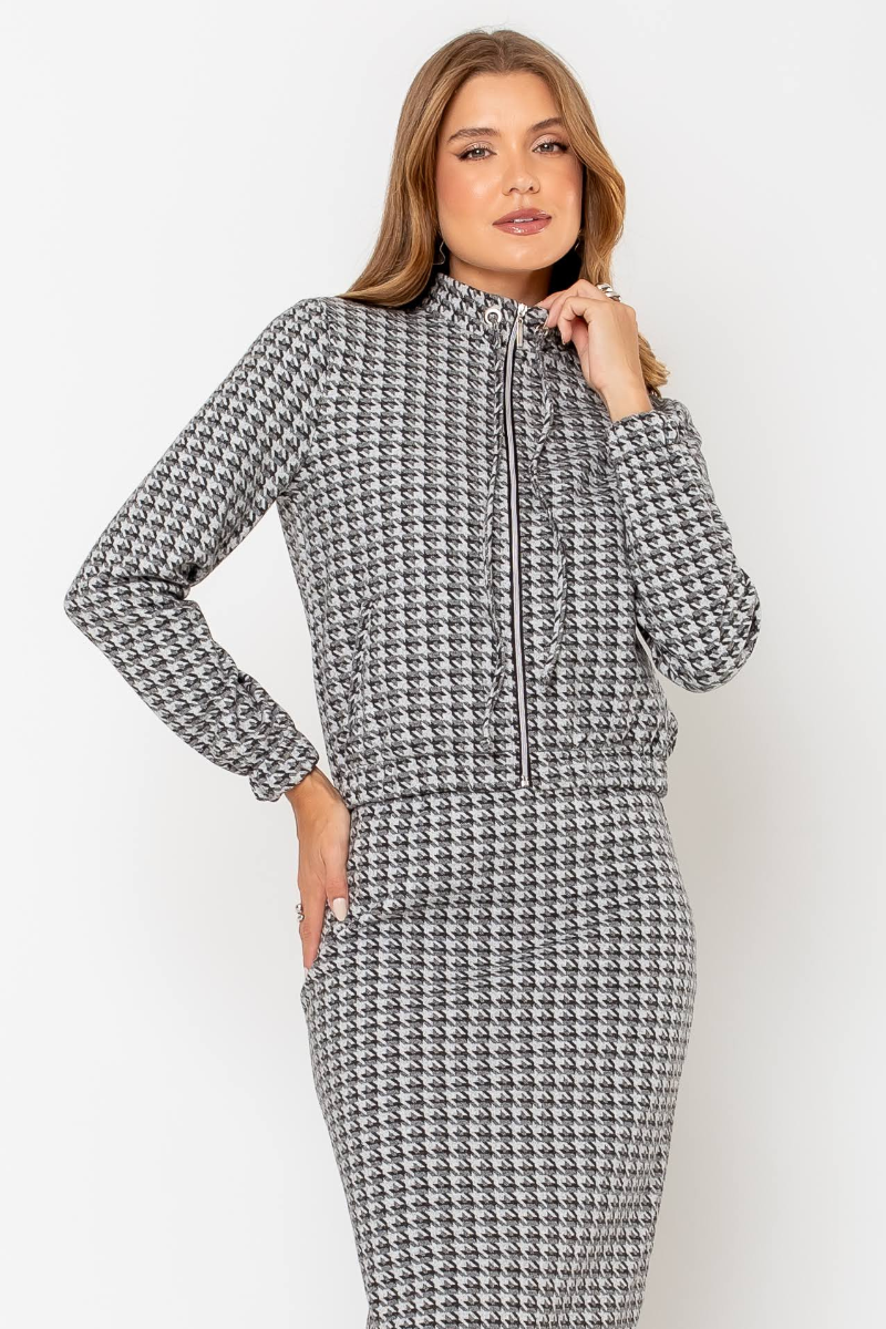 A jaqueta é confeccionada em malha pied de poule, um tecido 100% poliéster que oferece durabilidade, leveza e fácil manutenção. Sua textura característica adiciona um toque charmoso, enquanto a composição em poliéster garante resistência ao desgaste e a amassados. Além disso, o tecido proporciona uma sensação confortável ao toque, mantendo a peça com um visual encantador e prático para o uso diário.