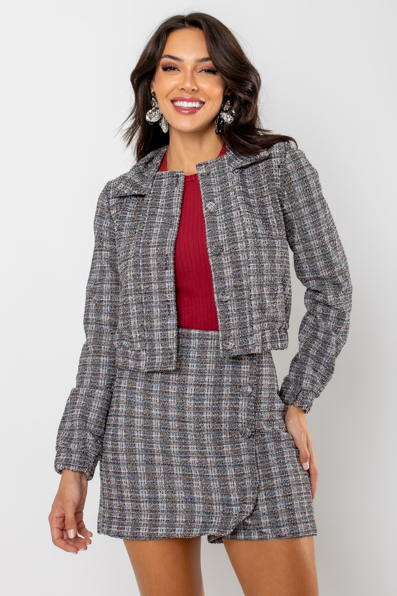Esta jaqueta, confeccionada em malha tweed com brilho, une conforto e estilo em uma única peça. Com 97% poliéster e 3% elastano, oferece um toque suave e aconchegante, perfeito para quem busca praticidade e um visual incrível no dia a dia.