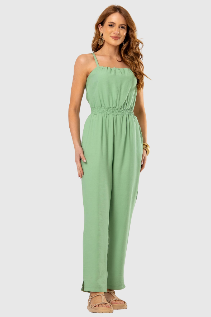 Este macacão apresenta um design charmoso e moderno, com um corpo confortável e ajustável. O decote frontal é franzido com elástico e possui alças reguláveis, garantindo um ajuste perfeito. O modelo marca a silhueta com um elástico embutido no cós, possui bolsos laterais ‘colegiais’ para praticidade e, na barra, conta com fendas laterais. Nas costas, destaca-se um decote V sutil e um fechamento por zíper.