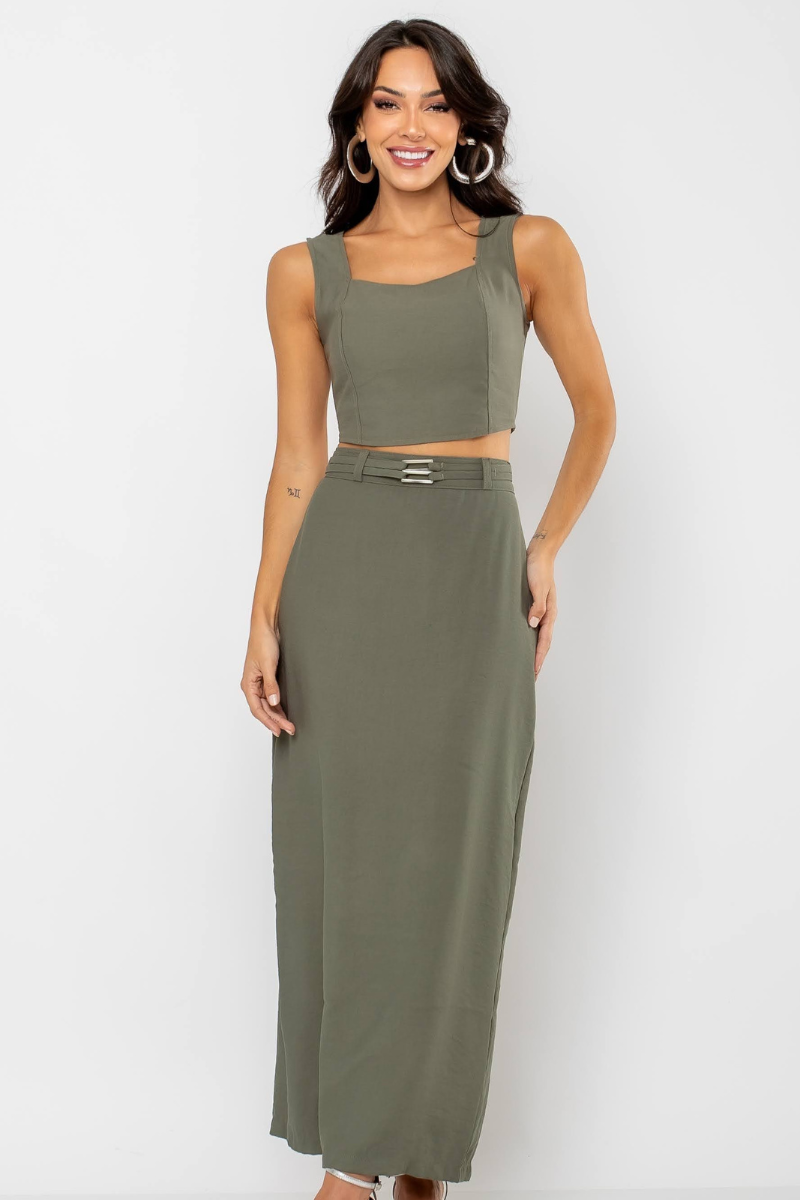 A saia se destaca pelos detalhes que conferem personalidade à peça. Sua modelagem longuete oferece um caimento clássico, enquanto o cinto duplo com fivelas traz um toque moderno. As pences garantem um ajuste perfeito ao corpo, valorizando a silhueta, e o zíper nas costas proporciona praticidade. A fenda adiciona movimento, completando o visual de forma estilosa.