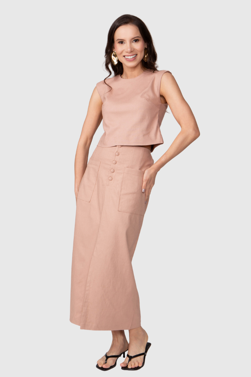 A saia é confeccionada em Linho Premium, um tecido que une 70% viscose, 28% linho e 2% elastano. Essa composição assegura um caimento leve e fluído, com toque macio e excelente respirabilidade, graças à alta concentração de viscose. A adição do linho confere a textura nobre e sofisticada da fibra, enquanto o elastano proporciona a mobilidade e o ajuste confortável, fazendo desta peça uma escolha de praticidade.