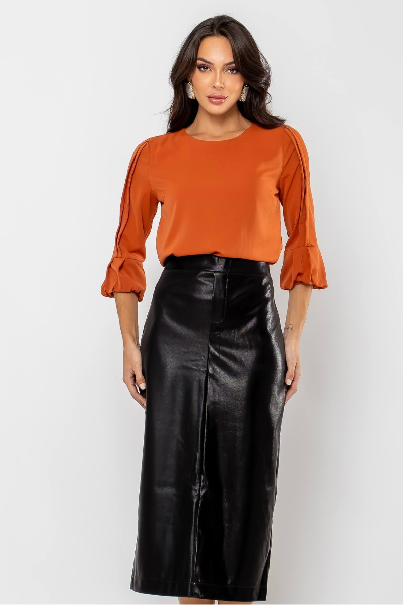 A saia é confeccionada em malha couro PU soft, composta por 100% poliéster, com acabamento peluciado internamente, o que garante um toque macio e aconchegante. O tecido imita o visual do couro sintético, oferecendo estilo, enquanto a composição em poliéster proporciona durabilidade e resistência. O acabamento peluciado adiciona conforto extra, tornando a peça uma opção versátil e confortável para diversas ocasiões.