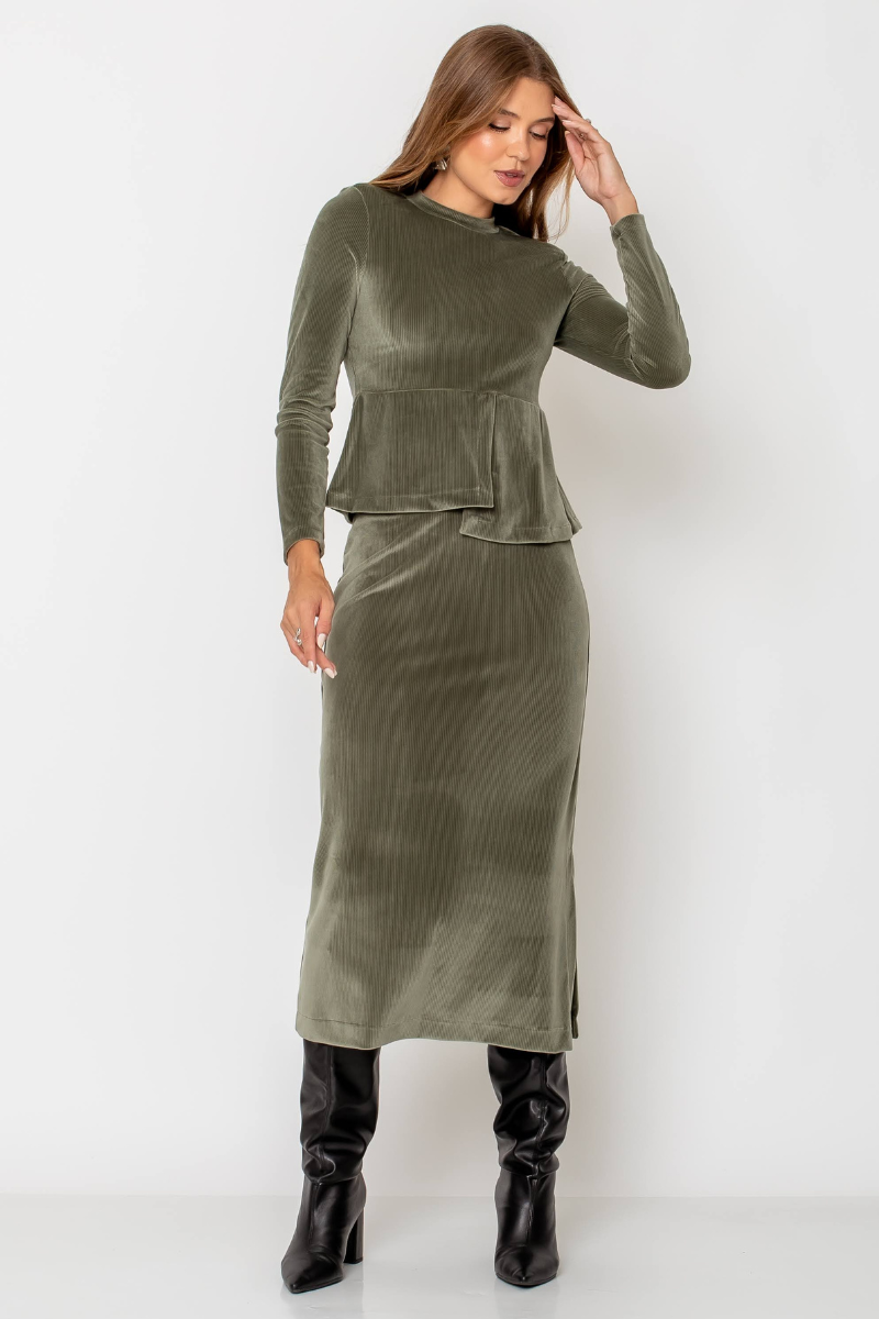 A saia é confeccionada em veludo, composto por 93% poliéster e 7% elastano. Esse tecido oferece um toque macio e suave, com um leve brilho que confere charme à peça. A composição em poliéster garante durabilidade e resistência, enquanto o elastano proporciona maior elasticidade e conforto, assegurando um ajuste perfeito ao corpo.