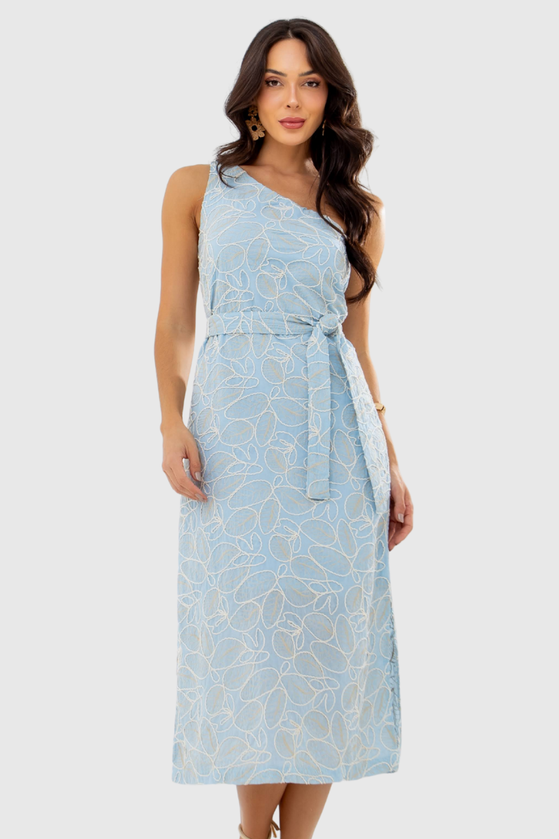 O vestido é confeccionado em Laise Bordado, 100% algodão, uma escolha que garante máximo conforto e um visual romântico; o algodão puro confere à peça excelente respirabilidade e maciez, ideal para o verão, enquanto o tecido Laise, com seus bordados realçados pelo contorno Cordonê, adiciona uma textura rica e um charme delicado de alto valor estético ao conjunto.