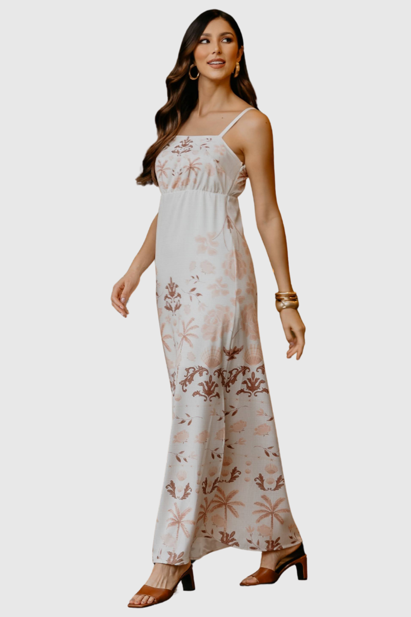 Este vestido longo possui um design visualmente minimalista e elegante. A modelagem é ajustada com pences no busto e recorte na cintura para definir a silhueta. Oferece praticidade com alças reguláveis e zíper lateral para vestir. O charme fica por conta da estampa localizada floral e das fendas laterais, que garantem leveza e movimento ao caminhar.