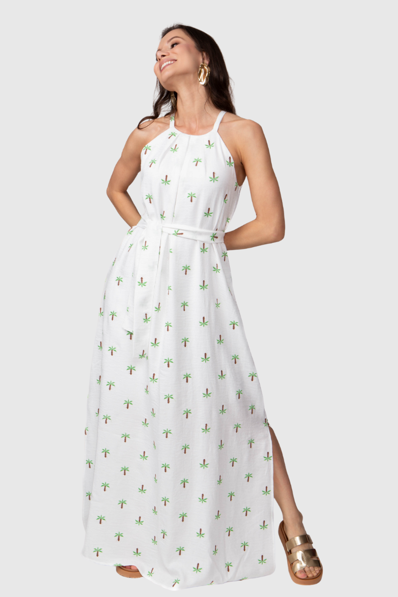 O vestido é confeccionado em tecido Bordado Lolis Summer, uma peça que combina o charme do bordado (coqueiros) com a praticidade do 100% poliéster, garantindo que o tecido seja leve, tenha bom caimento, não amasse facilmente, além de ser resistente e secar rapidamente.