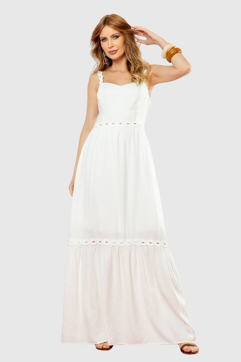 Desenvolvido com uma modelagem impecável, este vestido oferece um caimento que garante conforto e um visual encantador. O charme reside nos detalhes que elevam o design: apresenta decote coração, alças adornadas com gregas, e modelagem acinturada. É um modelo longo enriquecido com detalhes em gregas, um recorte franzido que forma um babado na saia, e finaliza com lastex nas costas para um ajuste perfeito ao corpo.
