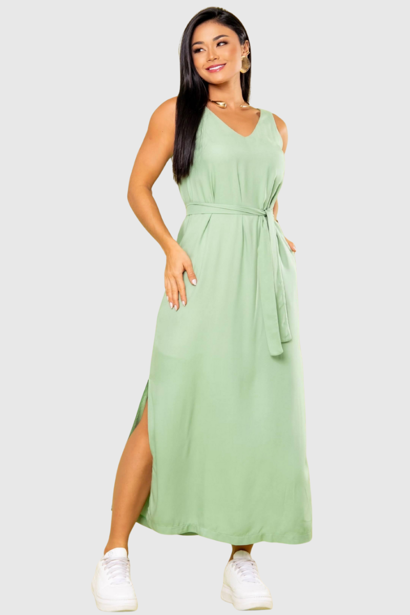 Este vestido longuete tem uma modelagem fluida e comprimento elegante. O design apresenta decote V que valoriza o colo, laços delicados nos ombros que funcionam como detalhe, e bolsos ‘colegiais’, que conferem um ar casual e prático. A fluidez da peça é acentuada por fendas laterais que dão movimento. Nas costas, possui um recorte estratégico que adiciona um toque final de estilo.