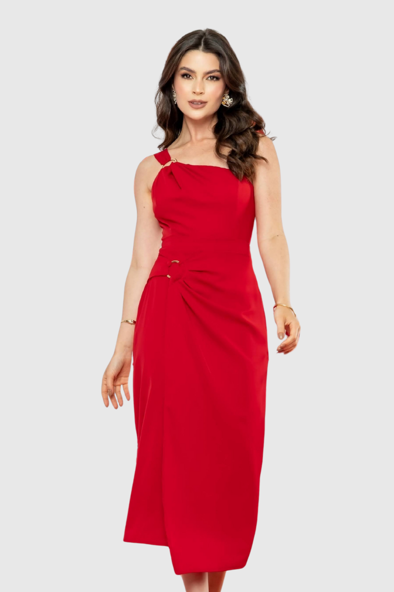 Desenvolvido com uma modelagem impecável, este vestido oferece um caimento que garante conforto e um visual encantador. O charme reside nos detalhes que elevam o design: o modelo é midi e apresenta decote assimétrico com franzido e uma argola que funciona como passante para a alça larga. A cintura é marcada por um recorte modelador. A saia possui uma camada transpassada adornada com argola, franzidos e pregas (adicionando movimento e volume). Nas costas, a peça finaliza com zíper, pences e fenda (elementos combinados para um ajuste perfeito e facilidade de movimento).