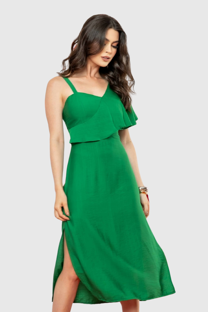 Desenvolvido com uma modelagem impecável, este vestido oferece um caimento que garante conforto e um visual encantador. O charme reside nos detalhes que elevam o design: o decote é assimétrico com uma alça larga (proporcionando sustentação), e o busto conta com recortes e um babado sobreposto. A modelagem é acinturada, e a saia midi possui fendas laterais. Para garantir um ajuste perfeito ao corpo, o vestido finaliza com lastex nas costas.