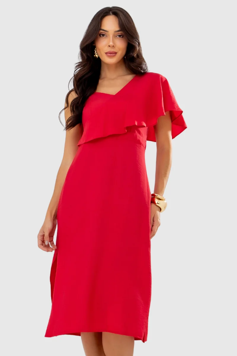 Desenvolvido com uma modelagem impecável, este vestido oferece um caimento que garante conforto e um visual encantador. O charme reside nos detalhes que elevam o design: o decote é assimétrico com uma alça larga (proporcionando sustentação), e o busto conta com recortes e um babado sobreposto. A modelagem é acinturada, e a saia midi possui fendas laterais. Para garantir um ajuste perfeito ao corpo, o vestido finaliza com lastex nas costas.