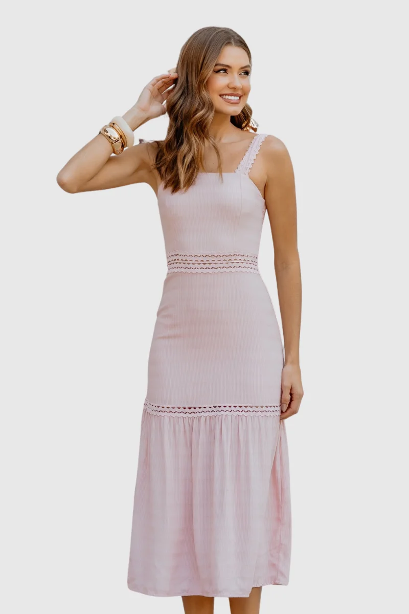 O Vestido se destaca pelo seu modelo charmoso e ajustado ao corpo, valorizando a silhueta com delicadeza. As aplicações em gregas nas alças e na cintura adicionam um toque artesanal à peça. Para completar o visual romântico, a saia possui leves franzidos que garantem um caimento fluido e muito movimento.